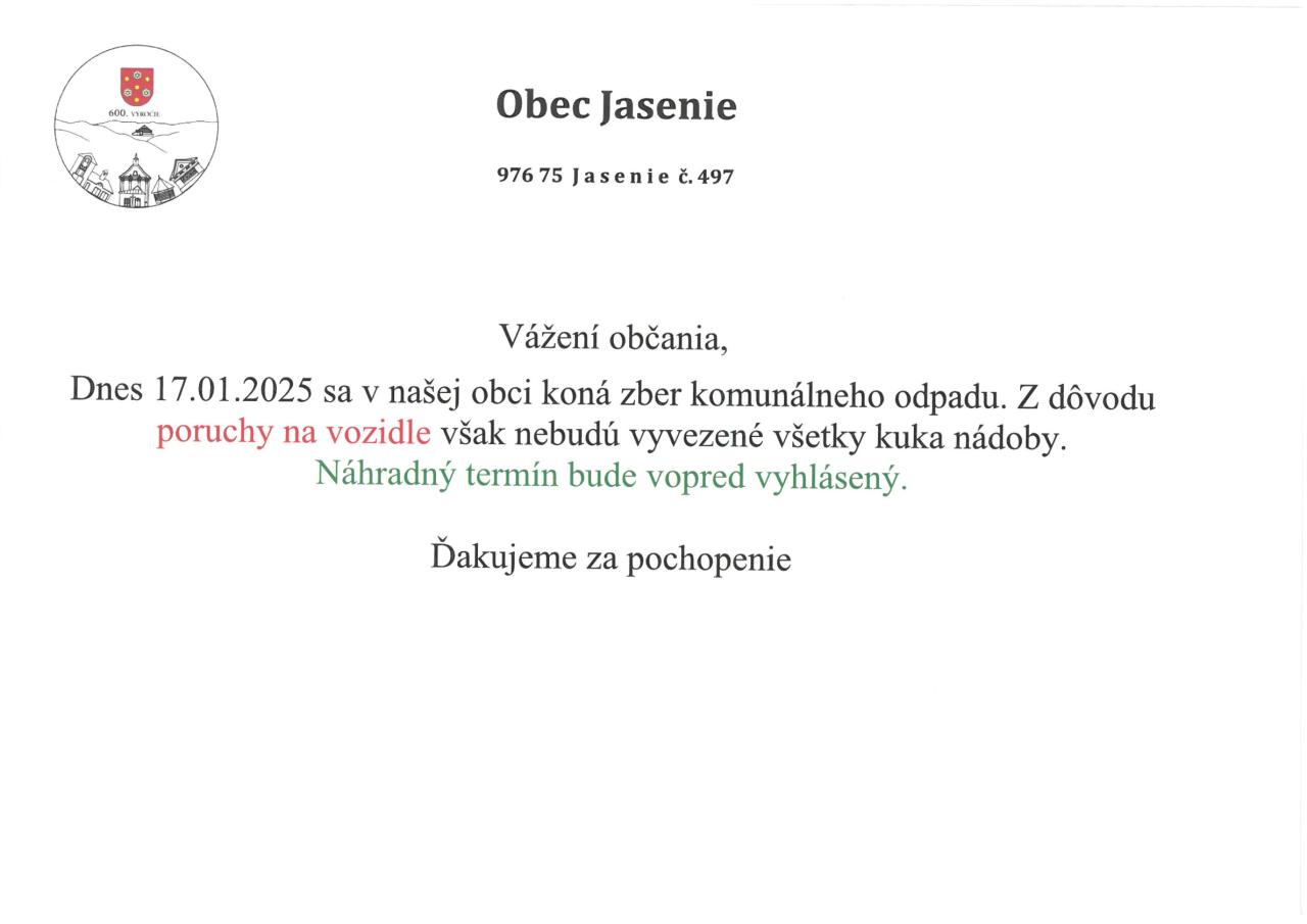Dnes 17.01.2025 sa v našej obci koná zber komunálneho odpadu. Z dôvodu
